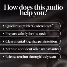 I’ll be honest—at first, I wasn’t sure what to expect. I’ve tried plenty of audio courses before, and many of them end up being forgettable. But I’m genuinely glad I gave this one a chance. It’s not your standard “sit still and breathe” kind of meditation program 🙌 One of the first things I noticed was how well-balanced the sessions are. The guidance feels warm and approachable, so I never feel like I’m navigating unfamiliar territory on my own. The affirmations are woven in naturally, and they have a way of boosting confidence without feeling forced. I found myself finishing each session feeling both calmer and more focused. What really stands out, though, is the emphasis on body-based relaxation. It’s not just about quieting the mind—it’s about reconnecting with the body in a deeper, more intentional way. That combination of mental and physical awareness is something I haven’t found in many other courses, and it makes each practice feel richer and more grounding. I also appreciate how this approach bridges the gap between the mind and body, helping me tune into both my emotional state and my physical presence. Over time, I’ve noticed the sessions becoming more meaningful, almost like each one is building on the last. It’s been a gradual but noticeable shift in how I handle stress and how connected I feel to myself. And then there’s The Golden Reset. For me, this has been the feature that ties everything together. Whether it’s early in the morning or late at night, it works reliably to bring me back to a place of calm when I need it most. It’s especially helpful on those days when my nerves are frayed or my thoughts won’t settle. Looking back, I’m really glad I decided to give this course a try. It’s become more than just a tool for relaxation—it’s something I look forward to using, and it’s had a real impact on how I navigate my day-to-day life. It feels like a solid investment in my own well-being ⭐⭐⭐⭐⭐